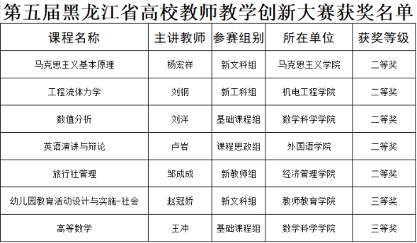 4月28日-29日,由黑龙江省教育厅主办的第五届黑龙江省高校教师教学创新大赛暨第五届全国高校教师教学创新大赛(黑龙江赛区)选拔赛在东北林业大学举行。我校8名教师在比赛中喜获佳绩,获二等奖5项、三等奖2项。机电工程学院杨瑞老师进入黑龙江省国赛选拔赛集训营并被评为优秀营员,实现了我校在这一赛事上的新突破。
