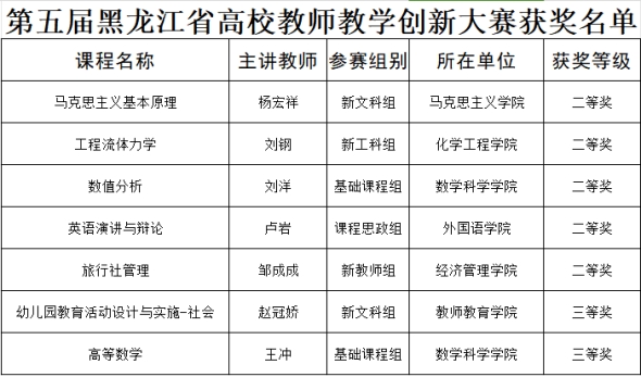 4月28日-29日,由黑龙江省教育厅主办的第五届黑龙江省高校教师教学创新大赛暨第五届全国高校教师教学创新大赛(黑龙江赛区)选拔赛在东北林业大学举行。我校8名教师在比赛中喜获佳绩,获二等奖5项、三等奖2项。机电工程学院杨瑞老师进入黑龙江省国赛选拔赛集训营并被评为优秀营员,实现了我校在这一赛事上的新突破。
